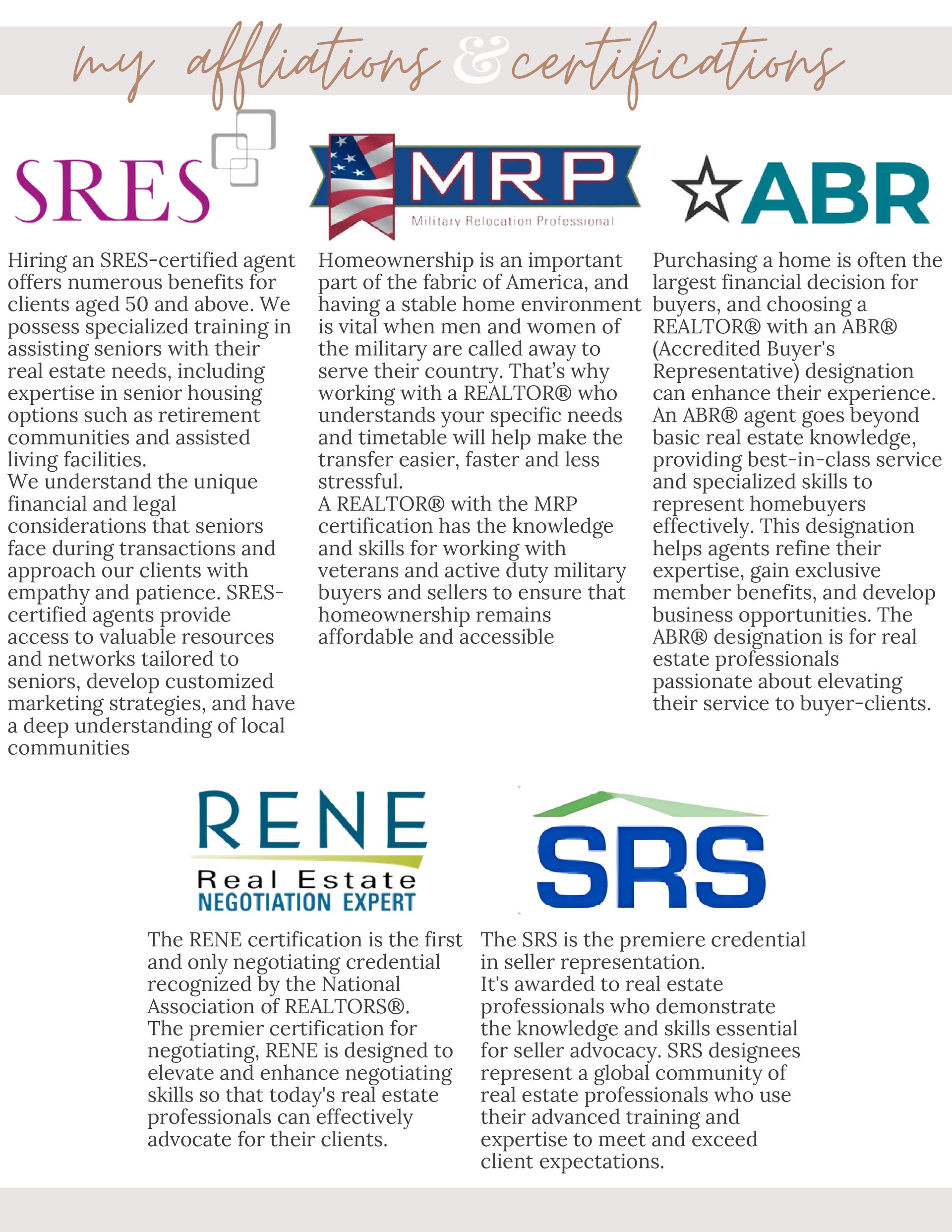 The SRS is the premiere credential in seller representation. It's awarded to real estate professionals who demonstrate the knowledge and skills essential for seller advocacy. SRS designees represent a global community of real estate professionals who use their advanced training and expertise to meet and exceed client expectations.